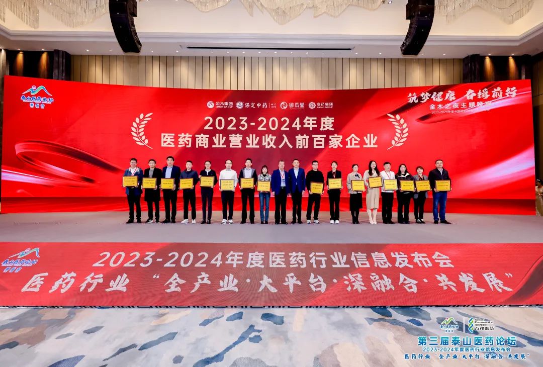 11月4日,“第三屆泰山醫(yī)藥論壇暨 2023 - 2024 年度醫(yī)藥行業(yè)信息發(fā)布會(huì)” 在山東省濟(jì)南市盛大召開,并發(fā)布了由全國工商聯(lián)醫(yī)藥業(yè)商會(huì)主辦、備受業(yè)界矚目的 “2023- 2024年度中國醫(yī)藥行業(yè)最具影響力榜單”。在該榜單中,海派醫(yī)藥再次榮登企業(yè)榜單,蟬聯(lián) “2023年度全國百家優(yōu)秀民營醫(yī)藥商業(yè)流通企業(yè)”稱號(hào)。