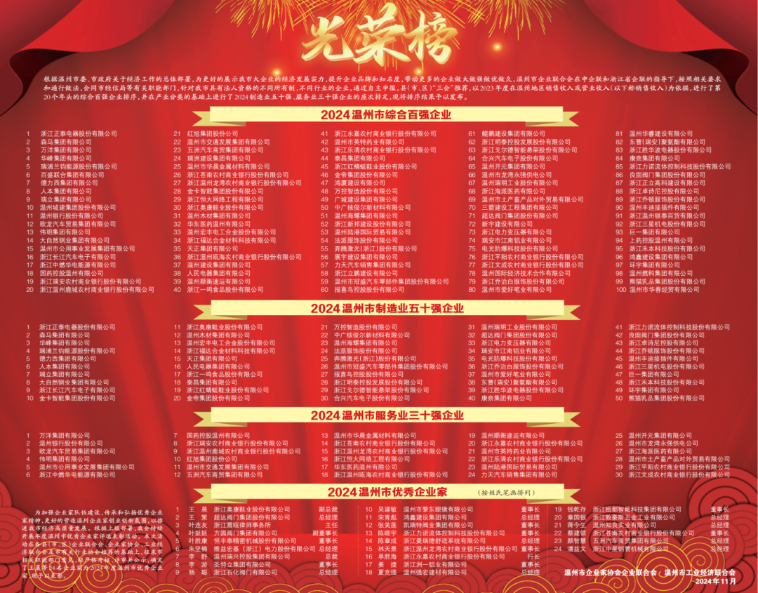 海派醫(yī)藥獲評(píng)2024溫州市綜合百強(qiáng)企業(yè)、服務(wù)業(yè)三十強(qiáng)企業(yè)榮譽(yù)稱號(hào)。