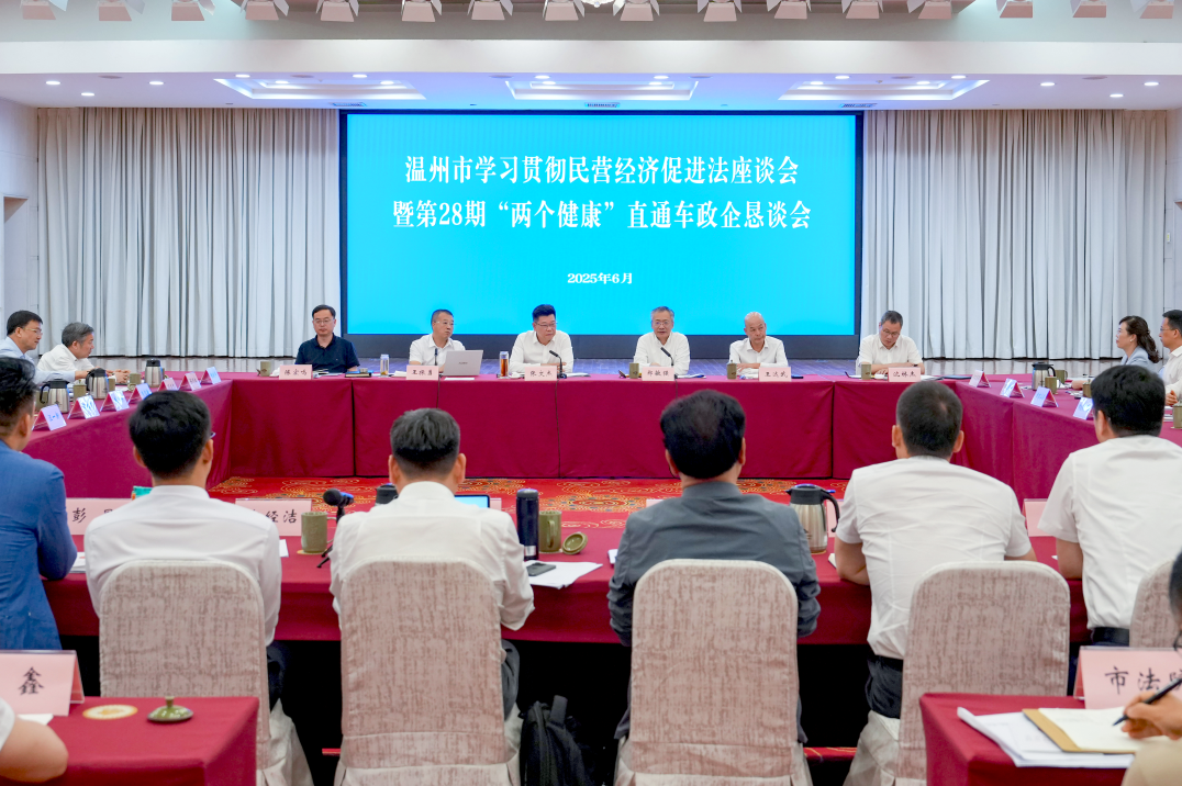 6月5日,溫州市召開(kāi)學(xué)習(xí)貫徹《民營(yíng)經(jīng)濟(jì)促進(jìn)法》座談會(huì)暨第28期“兩個(gè)健康”直通車政企懇談會(huì),深入學(xué)習(xí)領(lǐng)會(huì)習(xí)近平總書記在民營(yíng)企業(yè)座談會(huì)上的重要講話精神,深化對(duì)新頒布實(shí)施的《民營(yíng)經(jīng)濟(jì)促進(jìn)法》的學(xué)習(xí)、宣傳和貫徹。海派醫(yī)藥董事長(zhǎng)張翔在會(huì)上積極建言獻(xiàn)策。